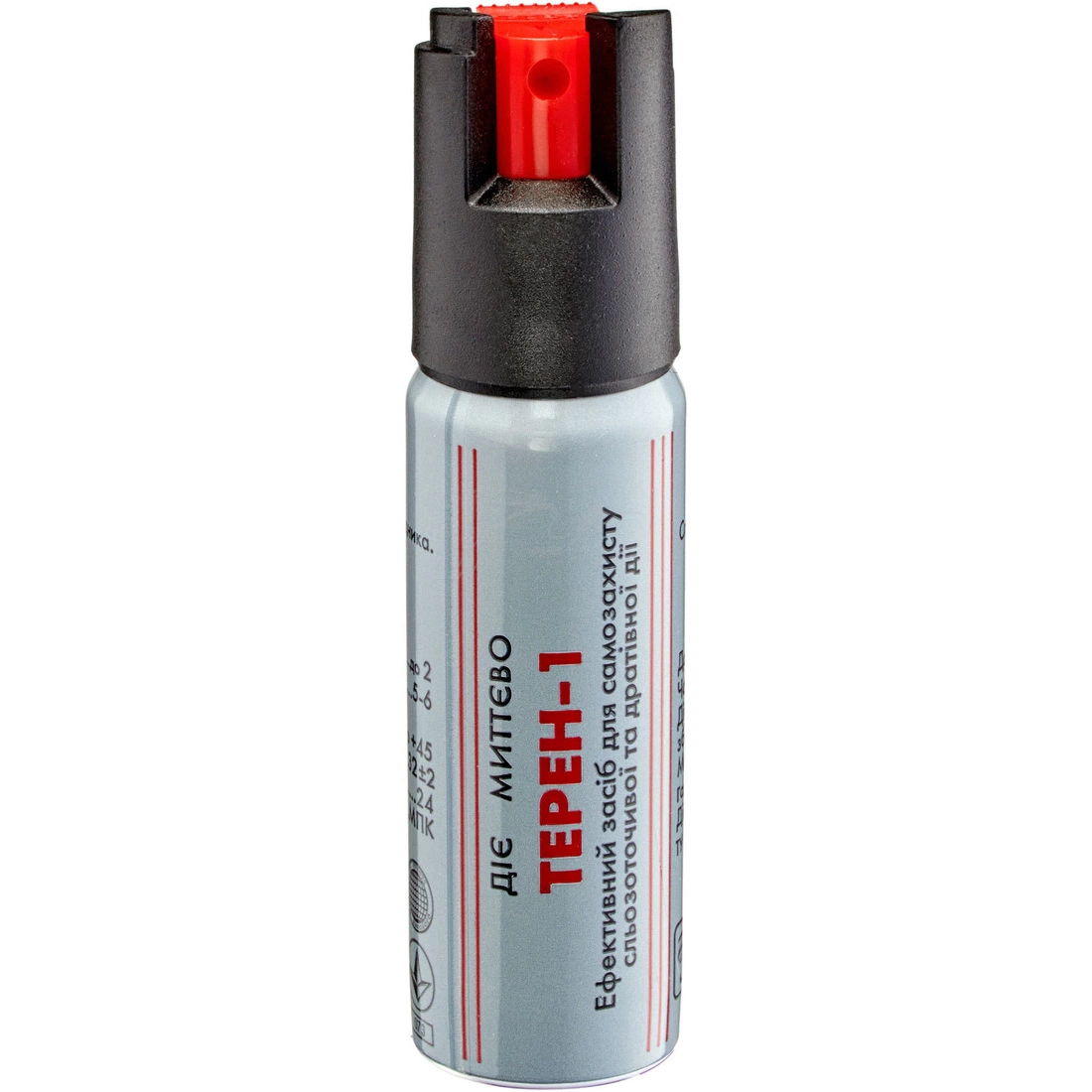 Вироби "Терен-1М" (ТУ У 29.6-19485052-019-2002 призначені для використання цивільними особами в якості засобу самозахисту і являють собою балони аерозольного типу, заповнені препаратом, що містить речовину сльозоточивої та дратівної дії (ирритант) - морфолид пеларгоновой кислоти. Препарат чинить вплив «конусом» аерозольного хмари, він ефективний при застосуванні як проти осіб, які перебувають у стані алкогольного сп'яніння, так і проти собак. Вироби є однофункциональными, невідновлювальними і неремонтируемыми. Застосовуваний склад не руйнує озоновий шар. Виріб сертифіковане.ЗАСТОСУВАННЯ