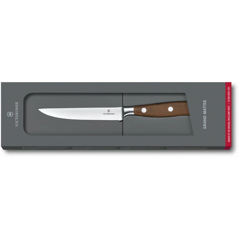 Victorinox GRAND MAITRE Wood Steak [77200.12 WG] - кований кухонний ніж з серрейторним лезом 12 см і елегантною дерев'яною рукояттю. Призначений для нарізки стейків та інших м'ясних страв. Висококласний швейцарський ніж від компанії Victorinox (Вікторінокс).