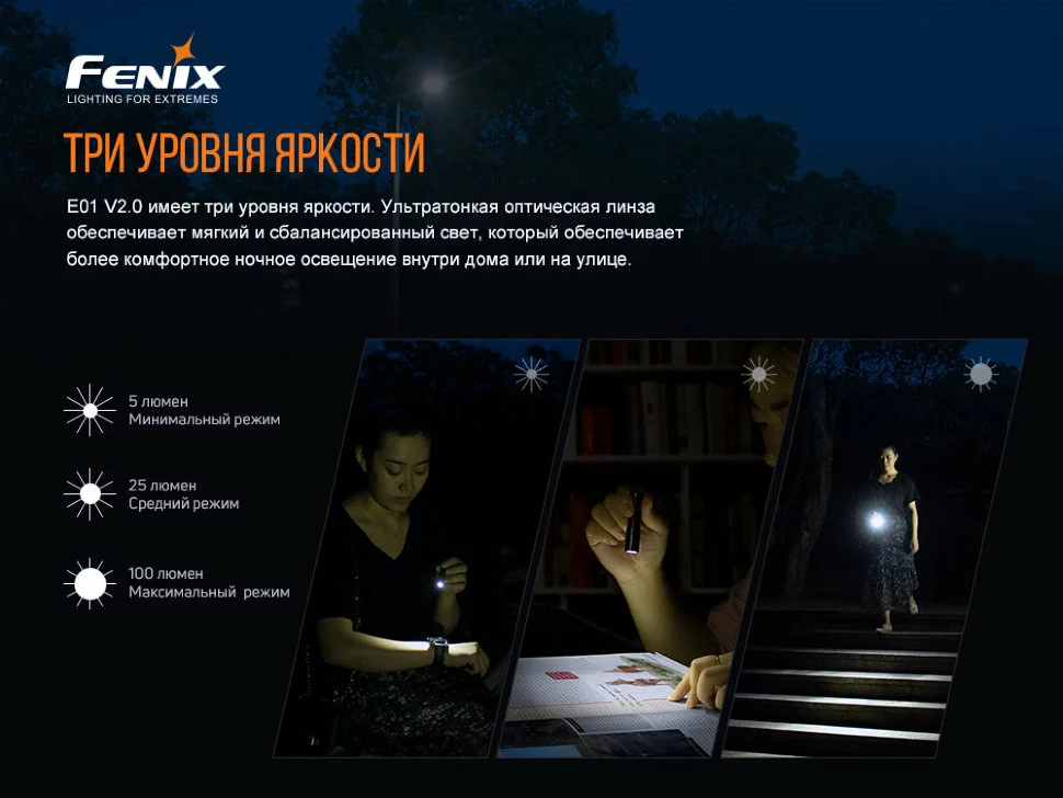 | Комплектація | Ліхтар Fenix E01 V2.0, батарея
