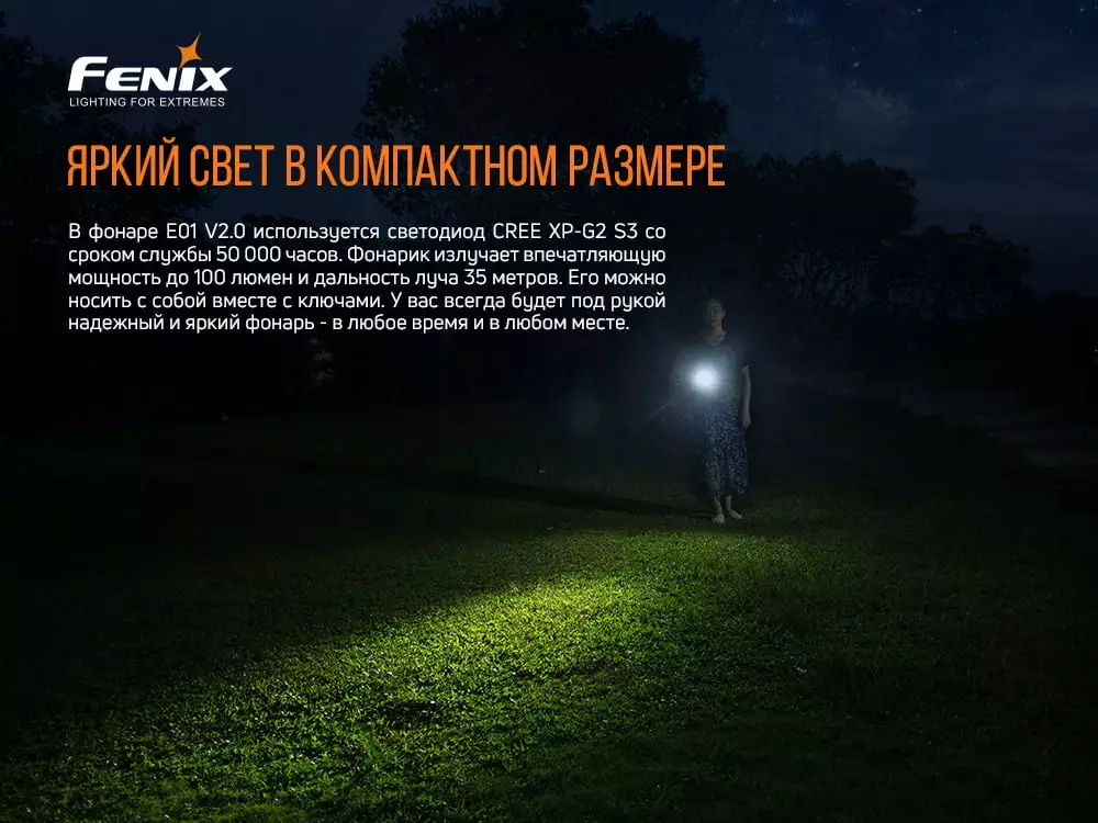 Модель ліхтарі Fenix E01 V2.0 продовжує лінійку EDC-виробів. Це дуже компактний ліхтар, прекрасно адаптований під ваш швидкий ритм життя і нагальні завдання. Його невеликі розміри і простота дозволяють завжди мати під рукою портативний джерело світла. Що добре для різних ситуацій на практиці. У складі моделі – діод популярного виробника Cree. А саме – XP-G2 S3, розрахований на роботу протягом 50 тисяч годин. Якісний світлодіод сприяє надійної і стабільної роботи виробу, даючи промінь з максимальною яскравістю 100 люменів. Цього рівня світла вистачає, щоб підсвічувати найближчі об'єкти перед собою. Або висвітлювати невелике приміщення. Далекобійність досягає 35 метрів.