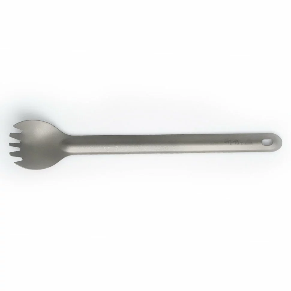 Ложка, поєднана з виделкою, зроблена з міцного і стійкого до зношування титану. Невелика, зручна, такою ложкою комфортно зачерпнути їжу, помішувати вміст тарілки або каструлі, накладати їжу в тарілку. Буде корисна в різних видах туристичної діяльності та активного відпочинку. Ложка може змінювати колір поверхні під впливом високої температури.