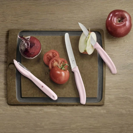 - ніж для чищення та різання томатів, довжина леза: 110 mm, колір рукоятки: світло-рожевий, заточка: хвилясте лезо з округленим кінцем