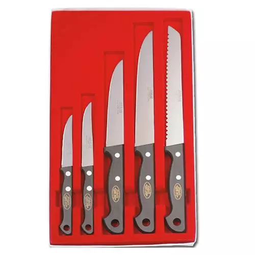 П'ятий ніж із набору відрізняється від попередніх тим, що його лезо заточене зубчиками. Що стосується форми, що лінія різу залишається рівною до самого кінця леза, зате вниз опускається обух ножа.