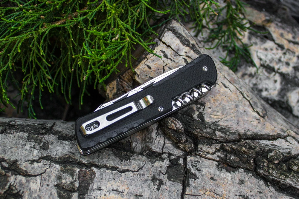 Ruike LD32 вийшов досить симпатичним, хоча дизайн в цілому – класичний і строгий. До складу ножа увійшло 13 різних інструментів: невелика пила по дереву, відкривачка банок і пляшок, отвори для зняття ізоляції з кабелів, штопор, дві викрутки, ніж для перерізання ременів, кільце під темляк і склобій. Крім того, прямо усередині рукояті розміщується пінцет, який можна використовувати окремо від ножа.