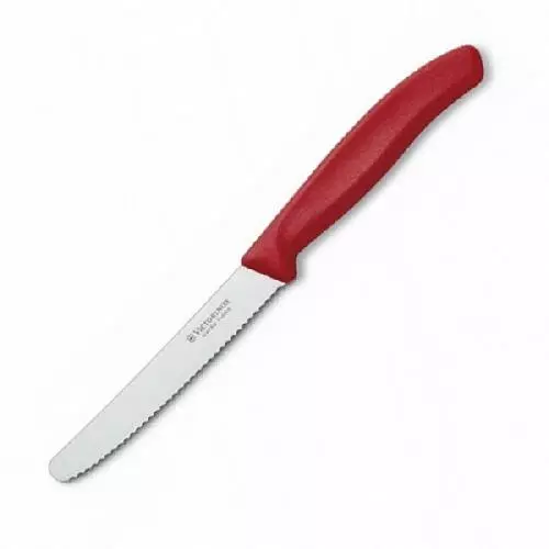 Класичний побутової ніж з серрейтерной заточуванням від Victorinox. Побутовий ніж з лезом 110 мм з високоякісної нержавіючої сталі. Буде корисним на кухні чи в туристичному поході. Ручка виконана з фиброкса. Ніж ідеально підходить для нарізки, очищення та декорування фруктів і овочів.