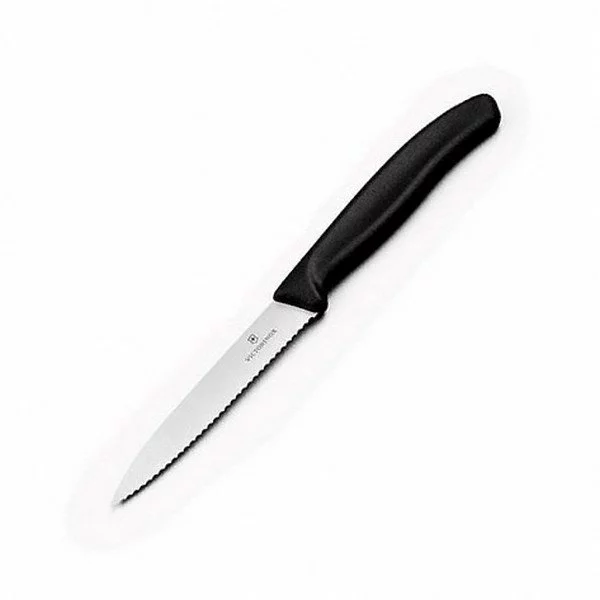 Швейцарський кухонний ніж з гострим кінчиком для чищення овочів, декоративного нарізування фруктів і м'яких продуктів. Форма ножа зручна, завдяки компактним розмірам клинка, дозволяє добре використовувати ніж тривалий час, без втоми. Лезо виконане з високоякісної нержавіючої сталі, а матеріал рукояті – чорний поліпропілен. Завдяки серрейторной заточуванні може використовуватися як стейковый ніж. Дана модель займе почесне місце на Вашій кухні і прослужить довгий час.