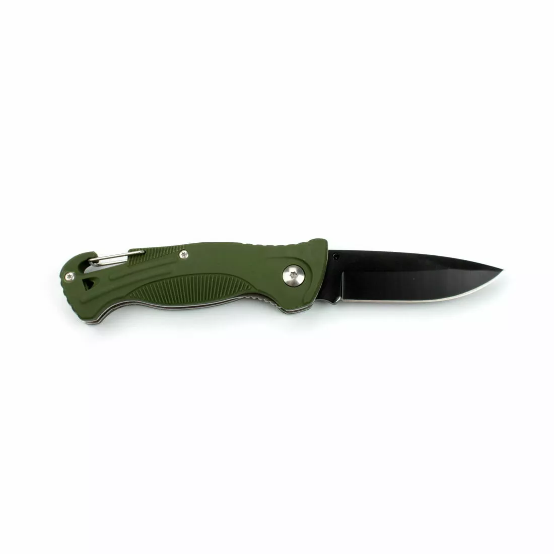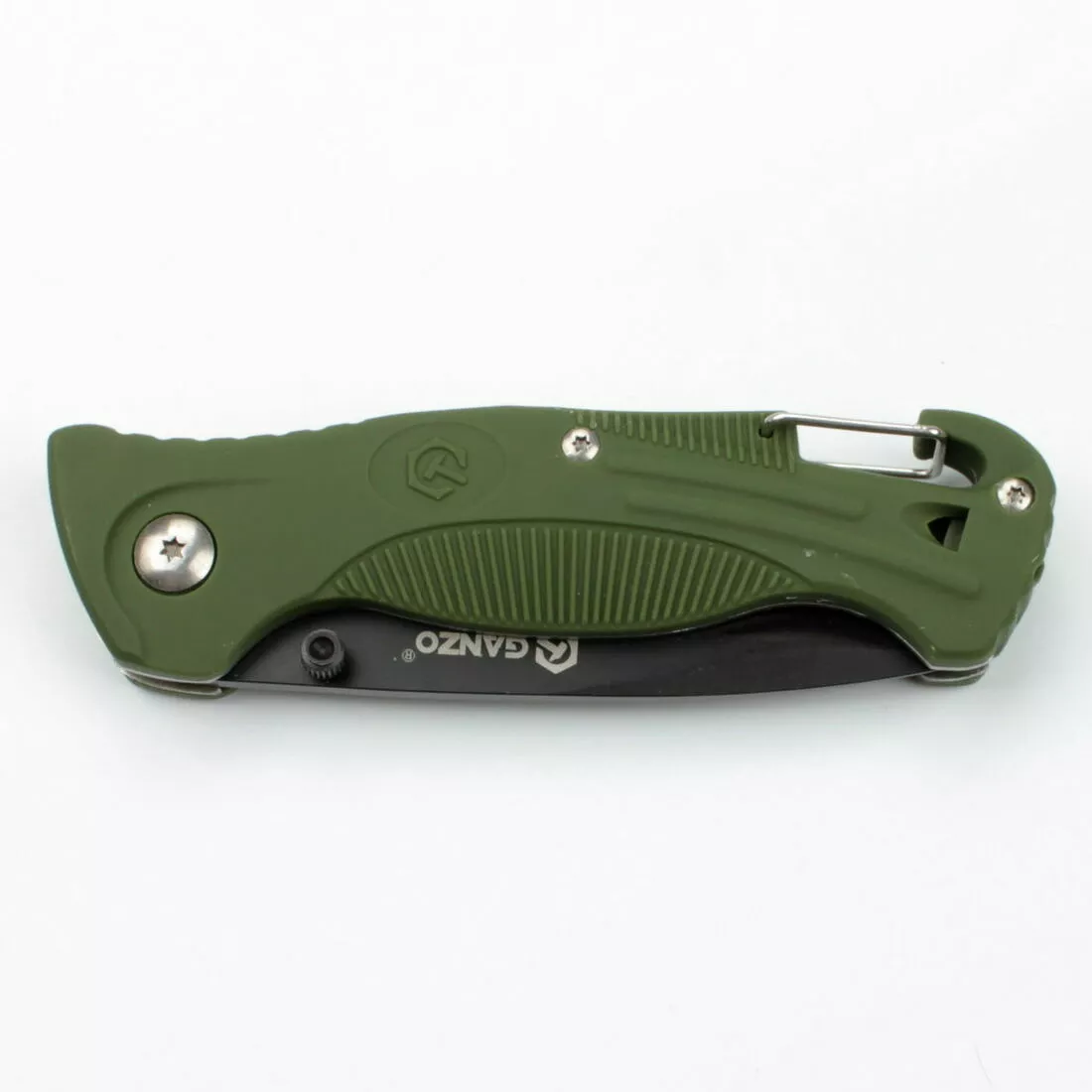 Рукоять ножа G611 green має зручну ергономічну форму і виконана з ударостійкого пластику зеленого кольору. Відмінною рисою моделі G611 green є наявність вбудованого в ручку свистка, який дозволяє подати попереджувальний сигнал під час непередбаченої ситуації або небезпеки. Також на рукояті розташований карабін, який дозволяє закріпити ніж G611 green на поясі або туристичному спорядженні. Замок Liner Lock надійно фіксує лезо (як у відкритому, так і в закритому положенні). Дана модель стане вашим незамінним помічником під час відпочинку на природі та в походах.