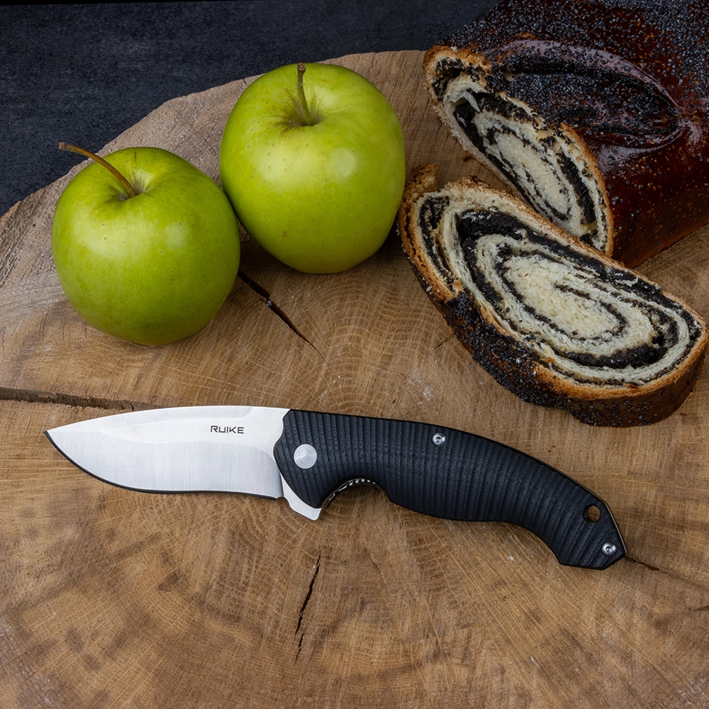 В основі рукояті Ruike P852-B лежать пара сталевих лайнерів з нержавіючої сталі марки 420. На них в свою чергу встановлені накладки з G10 чорного кольору з фактурною поверхнею. Подібне поєднання матеріалів, а також чудова збірка роблять рукоять ножа гранично міцною і стійкою до навантажень.