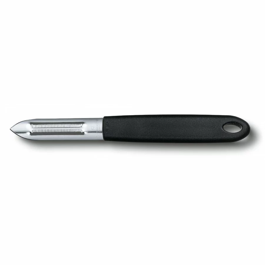 Традиційна форма овочечистки не вимагає ніяких додаткових навичок. Використовувати її легко і просто. Двосторонній варіант дозволяє працювати як до себе, так і від себе. Гостро заточений кінчик допоможе впорається з важкодоступними місцями.