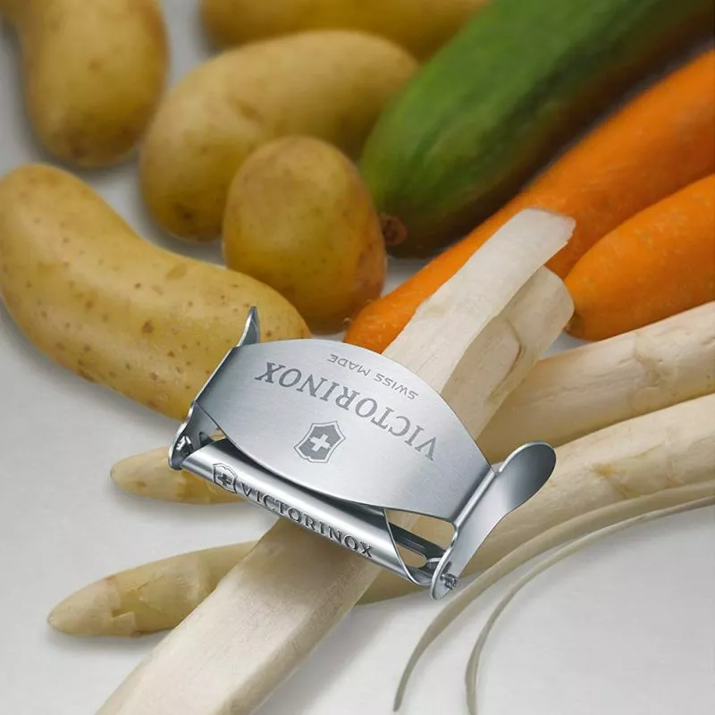 Victorinox Potato 7.6074 - картофелечистка/овощечистка швейцарського виробництва в сталевому дизайні. Компактна і зручна у використанні кухонне начиння, яка завдяки ультратонкому лезу відмінно справляється з усіма видами продуктів, навіть з більш жорсткими, такими як спаржа.