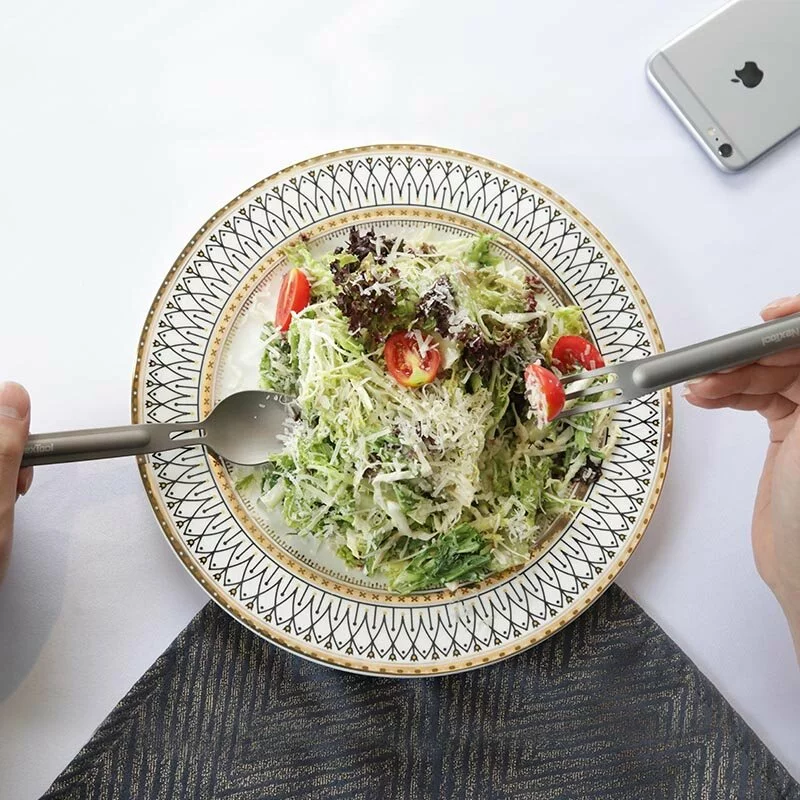 Насамперед, ложка і вилка оптимальні для комфортного захоплення рукою. Поглиблена ложка сприяє того, щоб ви могли зачерпнути більше їжі і з задоволенням її з'єднання їсти. Титанова вилка-ложка природно стійкий до іржі, стійка до дії кислот і лугів. Вам не потрібно турбуватися про те, що якісь із різновидів страв можуть зіпсувати зовнішній вигляд виробів і піддати їх корозії. Столові прилади мають лаконічним дизайном, мають matovu делікатну поверхню, привабливий колір. Їх зовнішній вигляд бездоганний, і не містить в собі нічого зайвого.