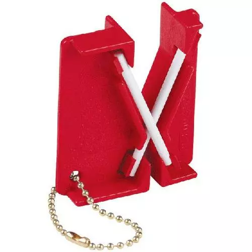Точилка має корпус червоного кольору з отвором для шнурка і кулькову ланцюг з бісеру. У точилке є утоплена область з нековзною поверхнею для більш зручного захоплення. Два знімних стрижня з глиноземний кераміки запросто підійдуть для заточування ножів, рибальських гачків, а також легкого очищення. Зернистість тонка. Кути заточування попередньо встановлені на 22,5 градуса, можливе досягнення кута в 45 градусів. Ви отримаєте кишенькові і легкі точила для ножів.