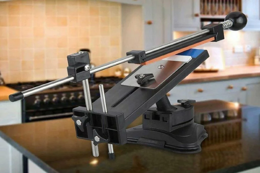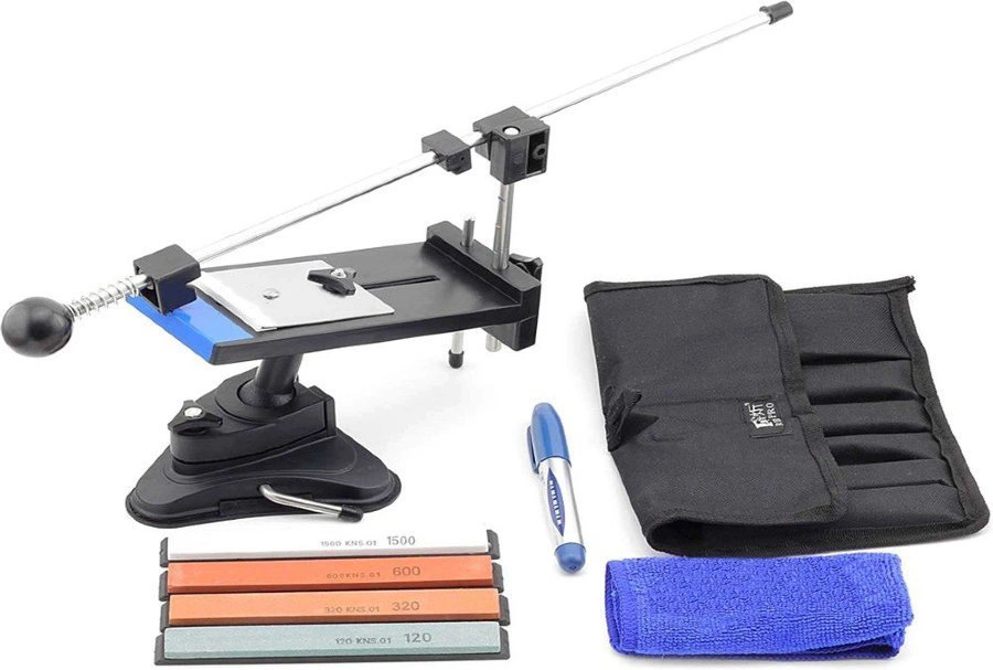 Удосконалена точильная система 30082 дозволяє реалізувати по-справжньому якісну заточку, з якою ваш ніж буде дійсно гострим. Природно, при цьому є можливість вибору кута заточування. Робота з ножами на точильному пристрої 30082 дозволяє добиватися добрих результатів навіть недосвідченим точильщикам, займаються впорядкуванням своїх ножів щоденного використання. У комплекті з точилкою йде ряд брусків на пластиковій основі. Таке розмаїття брусків диктується типом зернистості, всього чотири – на 120, 320, 600 і 1500 одиниць. Всі вони, а також синій маркер, зберігаються в чохлі-органайзері з кордуры. Крім того, в наборі є і м'яка серветка. Інструкція з докладними схемами допомагає розібратися в пристрої і складання пристосування. З допомогою шарнірного з'єднання станина кріпиться до конструкції, розміщеної на підставці з присоском. Присоска фіксує точило на стільниці або будь-якої плоскої поверхні. При цьому вона повинна бути не фактурної, а гладкою, інакше присоска не буде триматися. Кращий варіант – керамічна плитка.
